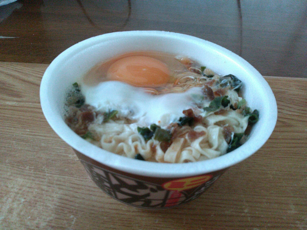 簡単に食べると言えば、インスタントのカップうどん。食器を用意する必要が無いし、生卵を入れれば、出来上がり。