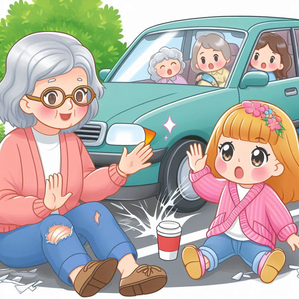 もう少しで、お婆さんは、自動車の下敷きになるところ・・・・自動車を運転していた、お婆さんの家族は、安心した、表情でした。