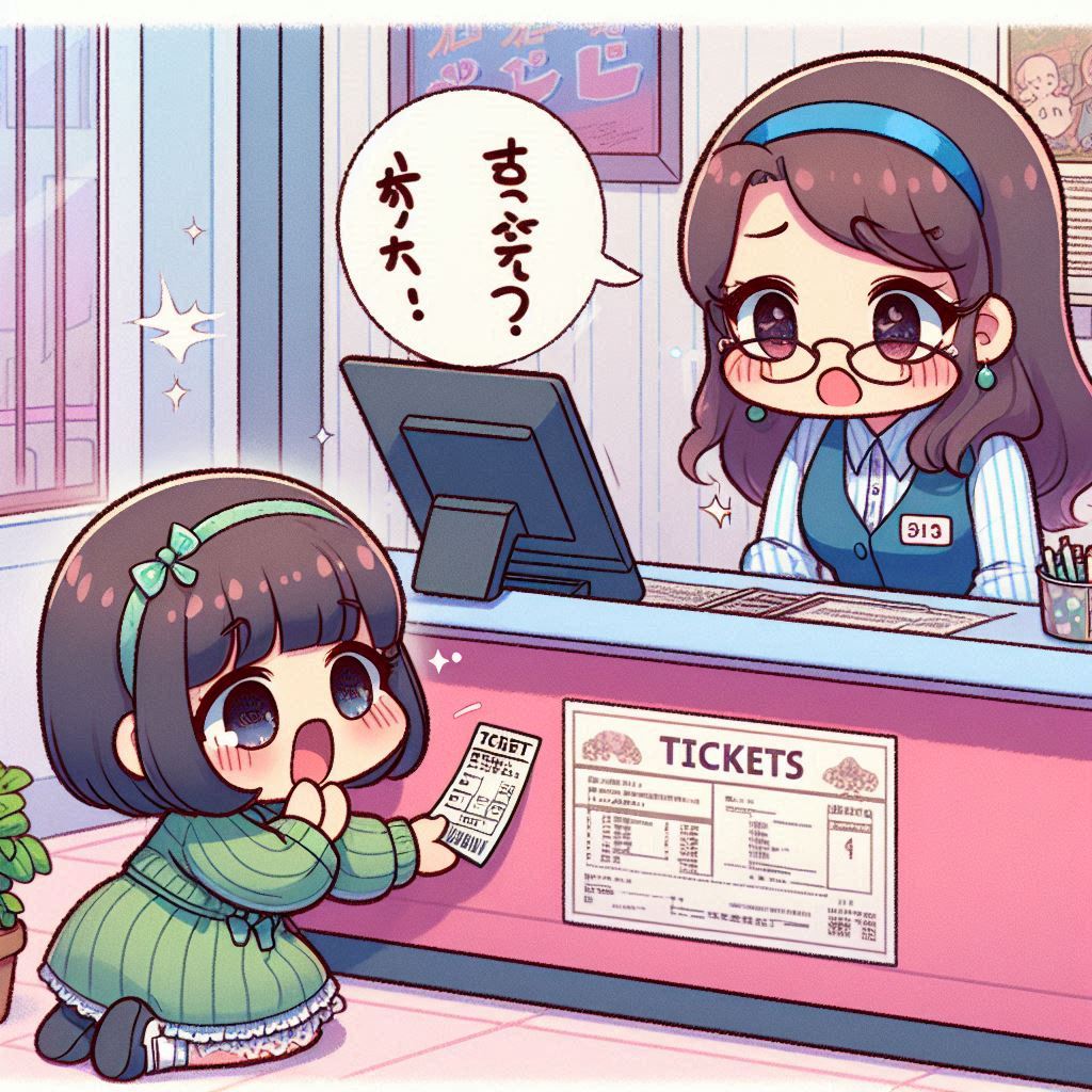 映画の上映が始まっています。でも私はチケットを持っていない。何とかしないと!とチケット売り場の人に頼んでみました。