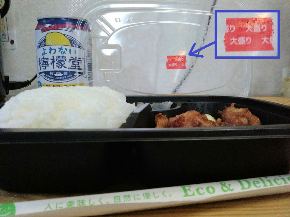 ちなみに、ご飯大盛りの時は「大盛りシール」が貼ってあります。